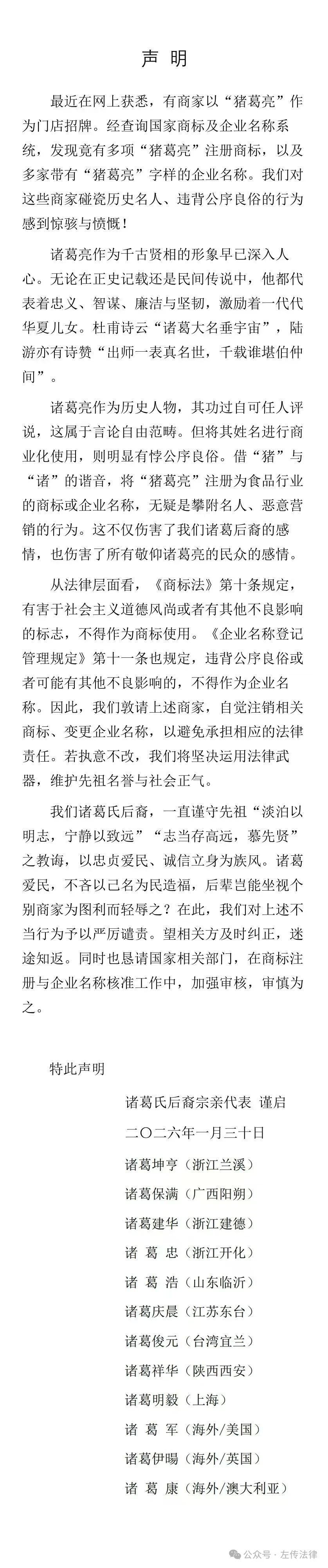 今天在网上看到一份诸葛亮后裔发布的声明(见标题照片),言之有理持之有故,对一些商人不当使用诸葛亮的名称,表示抗议。并提醒相关管理机关,慎重审核历史名人的商标与企业名称。